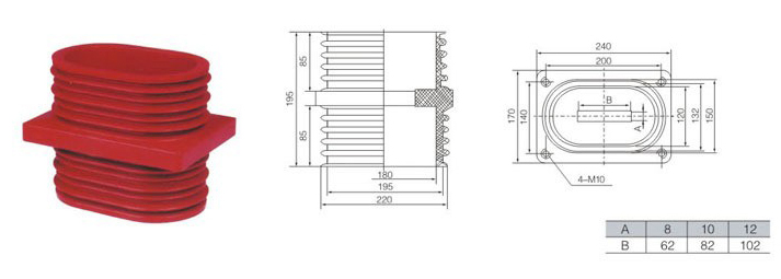 穿墻套管為環(huán)氧樹脂凝膠成型結(jié)構(gòu),外形結(jié)構(gòu)尺寸大小為170×240(140×200)mm、高195mm。主要適用于額定電壓為10KV及以下的 戶內(nèi)成套設(shè)備中,作絕緣隔離和聯(lián)接過度之用。套管耐污及潮濕,無需特別維護(hù),只需定期地清理表面污質(zhì)。安裝時母排從孔內(nèi)穿過。周圍環(huán)境溫度在+40℃~5℃之間;當(dāng)空氣溫度+20℃時,相對濕度布超過85% 無嚴(yán)重影響觸頭盒絕緣的氣體、蒸汽、灰塵及其它爆炸性和腐蝕介質(zhì)的場所。